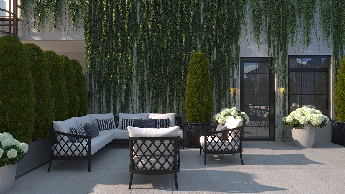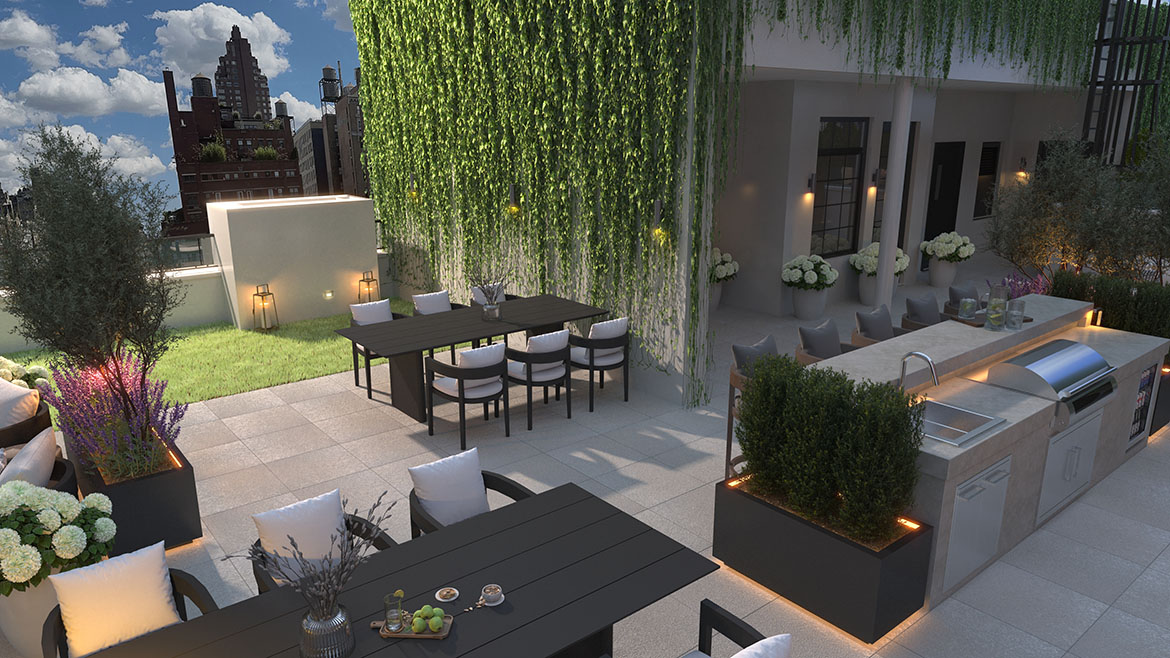 The amenity collection spans from essential conveniences to the most sophisticated offerings, including a dedicated bicycle room, thoughtfully designed children’s playroom, private storage units, a pet-friendly space, and a suite of meticulously curated lifestyle features. Wellness is redefined with a state-of-the-art fitness center, specialized yoga and spinning studios, and a serene spa retreat complete with a sauna, steam room, and invigorating cold plunge. Each residence is distinguished by an exceptionally expansive private terrace—uncommonly generous for the neighborhood—seamlessly extending the living space outdoors for entertaining, relaxation, and daily enjoyment. Atop the building, a verdant communal rooftop presents an elevated sanctuary, featuring recreational areas, landscaped gardens, a fully appointed kitchenette, and elegant lounge spaces enveloped in lush greenery.